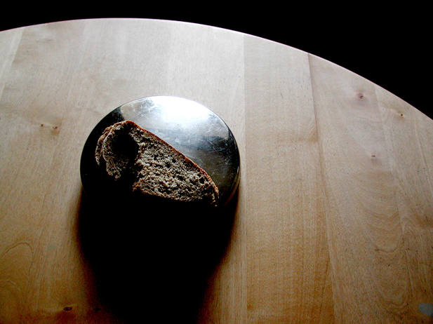 Kunst in ihrer reinsten, vom Zweck gelösten Ausformung. Aber es kann auch sein, dass er selbst inszeniert und dann, experimentierend, ebenfalls zu dieser Ebene vorstößt. So hat er auf den Kopf eines metallenen Topfdeckels, der Licht vom Fenster her auffängt, ein wahllos abgeschnittenes Stück Brot gelegt, dessen Rand mit einem leichten Bogen im Hintergrund korrespondiert, und er hat ein simples Weckglas mit Wasser gefüllt und geschaut, was Licht damit macht. Aber es kann auch sein, dass er drei trockene Herbstblätter, die sich zu bizarren Formen gedreht haben, aufstellt, als seien es Menschenfiguren, denen er im warmen, rötlich getönten Licht gestattet, ihre Gefühle auszutauschen.